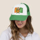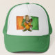 Este chapéu irlandês tem uma imagem de um gnomo vermelho engraçado vestindo um chapéu de cowboy, botas ocidentais com fivelas irlandesas, e shamrocks. Ele fuma um grande cachimbo e fica em frente a uma bandeira laranja, branca e verde da Irlanda.