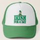 Características de design bonitos do dia deste St Patrick um leprechaun verde pequeno com um trevo grande em seu chapéu que senta-se sobre irlandês do grande texto verde "por um dia.