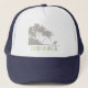 Este chapéu da lembrança de Costa Rica caracteriza um surfista cinzento, azul e amarelo que anda abaixo de um design árvore-alinhado palma da praia. Um grande chapéu da lembrança de sua viagem a Costa Rica ou a um grande presente para qualquer um que ama surfar para baixo em Costa Rica.