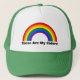 Trucker Hat with LGBT (lesbian, gay, bisexual, and transgender people) rainbow stripes, gay pride flag design, "These Are My Colors" template text, by pinkbrickroad
