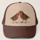 Este chapéu apresenta dois tentilhões masculinos na neve. Eles têm adorável plumagem vermelha na cabeça e no seio. A neve se agarra aos bicos.