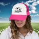 O Trucker Hat da Equipe de Futebol Personalizada para o Mães Design apresenta um logotipo simples e na moda com texto personalizado moderno. Personalize com o nome do seu jogador. As cores do design preto e do chapéu branco e rosa quente podem ser modificadas.
