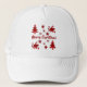 Merry Christmas greetings in holiday red decorated with snowflakes, Christmas trees and stars.