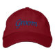 Boné de beisebol ajustável básico de roupa alternativa com bordado personalizado na cor vermelha com texto "Groom" em tipografia de letras em azul real e design gráfico digital pela loja TheFabricSeal sob encomenda no Zazzle.com #ZazzleMade https://www.zazzle.com/store/thefabricseal TheFabricSeal Original.