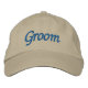 Boné de beisebol ajustável básico de roupa alternativa com bordado personalizado na cor khaki com a tipografia de texto "Groom" em azul real e design gráfico digital por TheFabricSeal loja de impressão sob demanda no Zazzle.com #ZazzleMade https://www.zazzle.com/store/thefabricseal TheFabricSeal©️Original.