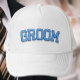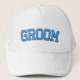 Mostre seu status de noivo com este design de tipografia “GROOM” em negrito e fonte universitária estilo varsity, apresentando letras azuis fortes que saltam com energia no dia do casamento. Perfeito para festas de solteiro, celebrações de noivado, preparativos de casamento ou diversão na lua de mel, este boné de caminhoneiro é uma maneira estilosa e divertida para o futuro noivo se destacar. Faz um ótimo presente para noivos e combina perfeitamente com acessórios “BRIDE” para fotos de casal.