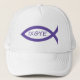 Nos círculos cristãos, o símbolo do peixe é muitas vezes usado para simbolizar o Cristo de Salvador Jesus. A língua dominante da Igreja primitiva era o grego, e em grego a frase "Jesus Cristo, Filho de Deus, Salvador" produziu a sigla ICHTHYS, a palavra grega para peixes. Um poema cristão do segundo século soletra a palavra com as primeiras letras de cada linha. Vista este chapéu para testemunhar da sua firme crença em Jesus Cristo, Filho de Deus, Salvador. O chapéu tem um peixe roxo com a sigla IXOYE dentro. Nos dias bíblicos, a realeza roxa significava, uma cor adequada para o nosso Senhor.