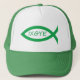 Nos círculos cristãos, o símbolo do peixe é muitas vezes usado para simbolizar o Cristo de Salvador Jesus. A língua dominante da Igreja primitiva era o grego, e em grego a frase "Jesus Cristo, Filho de Deus, Salvador" produziu a sigla ICHTHYS, a palavra grega para peixes. Um poema cristão do segundo século soletra a palavra com as primeiras letras de cada linha. Vista este chapéu para testemunhar da sua firme crença em Jesus Cristo, Filho de Deus, Salvador. O chapéu tem um peixe verde com a sigla dentro IXOYE. Não só nos dias bíblicos, mas até agora, verde significa muitas vezes vida nova. Uma cor adequada, nosso Senhor e Salvador, que deu nova vida ao crente de Jesus.