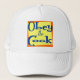 Um chapéu lendo Obey, o cozinheiro, um slogan da cozinha. Você deve obedecer ao cozinheiro se quiser comer! Para chefs com uma atitude! Um tipo de letra 50 a azul num fundo amarelo e laranja.