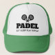 Padel Eat Sleep Play Repete o Trucker Hat de cor personalizada com o logotipo de raquete cruzado. boné legal com design de raquete cruzado e citação humorística. Adicione seu próprio texto personalizado opcionalmente. Chapéu divertido para amante de padel, jogadores, fãs, treinador, treinador de clube, festa, evento etc.