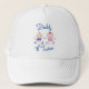 Bonito chapéu com "Pai de Gêmeos" em texto azul e menino e menina bonitinhos em roupas cor-de-rosa e azul.