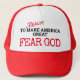 Mensagem muito oportuna dizendo: "Para REALMENTE Fazer Excelente Americano - MERECER DEUS" num chapéu de caminhoneiro vermelho familiar. Excelente testemunhar isso para os cristãos!