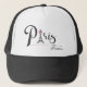Esta Paris negra moderna, design da Torre Eiffel com um arco rosa parece na moda neste chapéu de caminhoneiro. Gráfico de Inge Lewis. Muito chique para comprar, escola, praia, almoço e muito mais. Este é um presente excelente para amantes de Paris. Localize mais itens correspondentes na loja ingeinc.com.