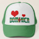Adorável Dominica Flag Hearts Patriotic Trucker Hat com a inscrição "Dominica" exibida na frente do chapéu. A inscrição é feita com o padrão e as cores da bandeira nacional Dominica. Dois corações vermelhos, um grande e um pequeno acabam o design. Corações totalmente personalizáveis ou removíveis usando o recurso "Personalizar!". Base que cor complementa muito bem o design. Este chapéu delicioso é um presente encantador e único. © 2023 PaísesDoMundo