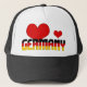 A Adorável Bandeira Alemã Corta o Chapéu Patriótico dos Caminhoneiros com a inscrição "Alemanha", mostrada na frente do chapéu. A inscrição é feita com o padrão e as cores da bandeira nacional alemã. Dois corações vermelhos, um grande e um pequeno acabam o design. Corações totalmente personalizáveis ou removíveis usando o recurso "Personalizar!". Base que cor complementa muito bem o design. Este chapéu delicioso é um presente encantador e único. © 2022 PaísesDoMundo