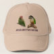 Uma conure verde-bochecha e uma conura com cabeça-cereja, também conhecida como periquito-mascarado vermelho, são mostrados juntos neste boné de caminhoneiro atraente
