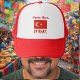 A bandeira turca mostra neste chapéu de caminhoneiro com a palavra TURKEY abaixo em cores que correspondem à bandeira. A bandeira é vermelha, com uma lua crescente branca e uma estrela branca. Há um espaço para adicionar seu nome, em letras vermelhas, para um toque personalizado, ou adicionar o nome de outra pessoa para um presente personalizado. Excelente para vestir a reuniões familiares, grupos viagens e clubes.