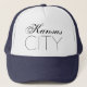 Texto preto Kansas CITY contra o fundo branco. Bonito, monótono, incrível chapéu de caminhoneiro para qualquer um. Na moda, fontes decorativas. Personalizável. Você pode mudar o texto do modelo. Use o botão PERSONALIZAR para personalizar o chapéu. Não se esqueça de escolher outro estilo do chapéu e cor do fundo. Divirta-se!
