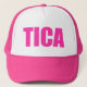 Um chapéu de caminhoneiro cor-de-rosa da Costa Rica. Devido a uma falta de fala, Costa Ricanos são chamados de Ticos. Como o espanhol usa substantivos masculinos, um homem costa-riquenho é um Tico, e uma mulher costa-riquenha é uma Tica.