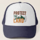Este camionista arrojado e ecologicamente consciente que apresenta a frase "PROTECT THE LAND" com uma ilustração impressionante da cordilheira. O design usa uma paleta de cores de alto contraste de verde, ferrugem e laranja profundos.