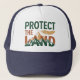 Este boné de caminhoneiro ousado e ecológico apresenta a frase "PROTECT THE LAND" com a palavra "LAND" incorporando uma impressionante ilustração de uma cordilheira. O design usa uma paleta de cores de alto contraste de verde profundo, laranja enferrujado e dourado. Uma pena detalhada com trabalho de linha flutua acima do design, adicionando um elemento poderoso inspirado nos indígenas.
