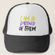 I am so proud of them hat written in yellow, white, purple, and black for nonbinary parents. Show your pride for your non-binary child with the non binary colors for a mom or dad.