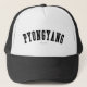 Verifique para fora este chapéu de Pyongyang! É você de Pyongyang, Coreia do Norte? Você tem um amigo ou um membro da família que amem Pyongyang, Coreia do Norte? Em caso afirmativo, este chapéu da "bandeira" é exatamente o presente que você está procurando! As características de design "Pyongyang" na rotulação preta arqueada na pia batismal clássica da faculdade.