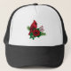Hand-drawn red cardinal bird perching on a Christmas bouquet of fir branches poinsettia and red berries