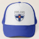 A bandeira nacional da Finlândia é infundida numa forma de escudo que tem contornos azuis e brancos nas cores da bandeira. O nome do país é adicionado acima da imagem.