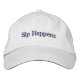 Keep it classy with a hint of humor in this “Sip Happens” embroidered baseball hat. Featuring crisp navy blue stitching on a classic white cap, this preppy design is perfect for wine lovers who enjoy a little fun with their fashion.