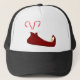Um Slipper de Elf Vermelho com Canas Doces Striped Vermelhas e Brancas em um fundo branco.