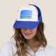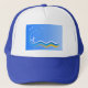 © Sunny Mars Design - Surf Trucker Hat - Este abstrato legal impresso por mmens e mulheres boné impresso por surf, contém uma silhueta branca de surfista surfando em uma onda com gaivotas voando acima sobre um fundo azul.