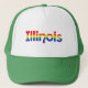 Trucker Hat com o sinal de texto " Illinois" em cores da bandeira do orgulho arco-íris LGBT (lésbica, gay, bissexual e pessoas transexuais), amor ao arco-íris, amor ao gay, orgulho estatal americano lgbtqiap+ design
