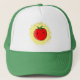 Um tomate vermelho bonito estilo cartoon. Chapéus de caminhoneiro personalizados. Design desenhado à mão com abertura de tinta amarela no fundo. Dar uma ideia para pessoas de todas as idades que amam tomates e legumes fofos.