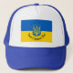 Trucker hat with the flag of Ukraine, a blue and yellow flag with the Ukrainian coat of arms (emblem) with a trident in the center, and a custom text template for your message