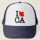 Gift your friend this hat with the Canadian Maple Leaf in red. The text is a version of American Typewriter. The text is bold and black. You can read it as "I Love Canada". CA is the two letter ISO country-code for Canada.
