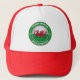 Um design patriótico com uma bandeira 3D galesa arredondada dentro de um anel externo colorido em galês. O texto mais alto é de origem celta e traduz-se como Wales Forever. O texto inferior é o significado inglês do texto superior.