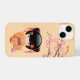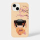Ilustração vetorial de uma menina oriental fofa com um vestido kimono cor de pêssego e uma faixa obi de ameixa larga segurando uma bolsa de cordão pink kinchaku. O cabelo preto da menina é decorado com fitas e presilhas de cabelo no estilo geisha. A boneca foi nomeada em homenagem à árvore japonesa ume que está relacionada às árvores de ameixa e damasco. Esta obra de arte foi inspirada nas tradicionais bonecas kokeshi do Japão. O fundo amarelo claro tem um padrão tradicional de ondas japonesas e é decorado com galhos de árvore ume em flor.
