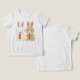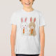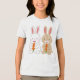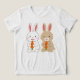 Uma ilustração com dois adoráveis cachos de desenho animado, um branco e um marrom-claro, cada um segurando uma vibrante cenoura laranja. Ambos os coelhos têm bochechas rosadas e uma expressão doce, representada num estilo simples e encantador.