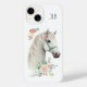 Uma capa de telefone com uma ilustração mágica de uma bela cabeça de cavalo branca. Cercado por pequenas flores cor-de-rosa giras. Boho elegante para amantes de cavalos.