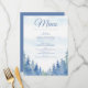 Cartão de cardápio de casamento inspirado em Woodland. O design apresenta uma paisagem serena azul e verde de floresta aquosa ao longo da parte inferior, combinada com um roteiro clássico azul e fontes serif para uma aparência refinada. Perfeito para casamentos rústicos, ao ar livre ou com temas naturais, este cartão de menu mostra seus cursos e detalhes personalizados em um layout claro e na moda. O fundo pastel macio e a borda romântica da pinheira adicionam um toque de tranquilidade a cada lugar, criando uma experiência memorável de jantar para seus convidados