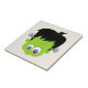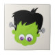 Um azulejo cerâmico com um adorável rosto de monstro frankenstein. Ele tem olhos grandes e um sorriso com uma cicatriz na testa. Pinos clássicos saindo dos lados de sua cabeça. Esta cara é realmente fofa e não assusta de todo.