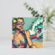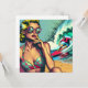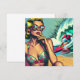 Bonito loira loira sentada na praia com óculos escuros assistindo um surfista gostoso em cores vintage em um estilo cômico de pop-art.