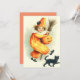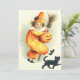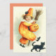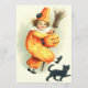 Dê um brinde ao seu truque neste Halloween. Este impressão retrata um carregando de palhaço bonito, um sorriso de lanterna, uma vassoura na mão e um gato preto nos pés.