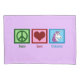O presente dos Unicórnios do Peace Love com um sinal de paz, coração, e um belo unicórnio com um homem roxo.
