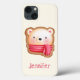 Uma capa de telefone com um rosto de urso fofo e adorável colocado em uma base de biscoitos. Vestindo um cachecol listrado vermelho e branco.