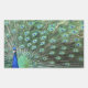 Um pavão colorido com penas de cauda enlouquecidas enfeita esses paus.