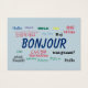 Bonjour Hello Languages World Viagem Colorful design, cumprimentando em vários idiomas. Frente design: Alô nos seguintes idiomas: português do Brasil, chinês, holandês, inglês, francês, alemão, Hausa, Igbo, italiano, jamaicano Patois, japonês, coreano, norueguês, espanhol, sueco, tailandês e Yoruba. Espaço para adicionar "saudação" em outros idiomas acima e abaixo, para substituir idiomas e/ou movê-los. Design de trás: Modelos para informações de contato comercial, incluindo nome da empresa, nome, cargo, telefone, email e contato profissional.