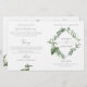 Programa de celebração de casamento com folhas botânicas verdes delicadas, geometria de ouro e texto de caligrafia.