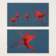 Uma família de origamis vermelhos voa sobre a água tranquila de uma piscina enquanto as gotas de chuva se espalham ao seu redor.